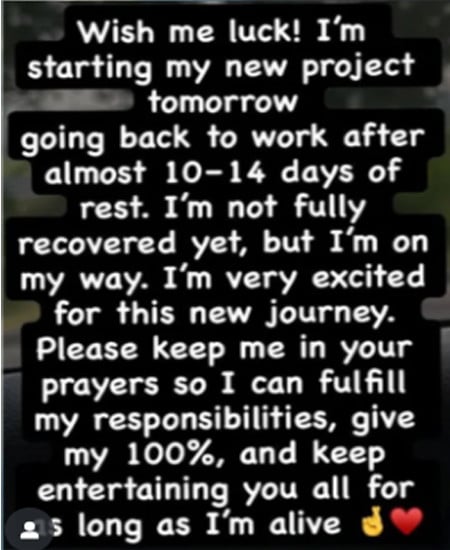اب اداکارہ نے اپنی انسٹاگرام اسٹوری میں تصویر شیئر کرتے ہوئے بتایا کہ وہ تقریباً دو ہفتے بعد اپنے نئے منصوبے پر کام شروع کر رہی ہیں۔ انہوں نے لکھا ’’میں نئے پروجیکٹ کے لیے بہت پرجوش ہوں اور ہمیشہ کی طرح اپنی بہترین کارکردگی دکھانے کی کوشش کروں گی۔‘‘ تاہم انہوں نے واضح کیا کہ ابھی وہ مکمل طور پر صحت یاب نہیں ہوئی ہیں، لیکن ان کی صحت بتدریج بہتر ہو رہی ہے۔ صبا قمر نے اپنے مداحوں کی دعاؤں کا بھی شکریہ ادا کیا، اگرچہ انہوں نے اپنے نئے منصوبے کی تفصیلات ظاہر نہیں کیں۔