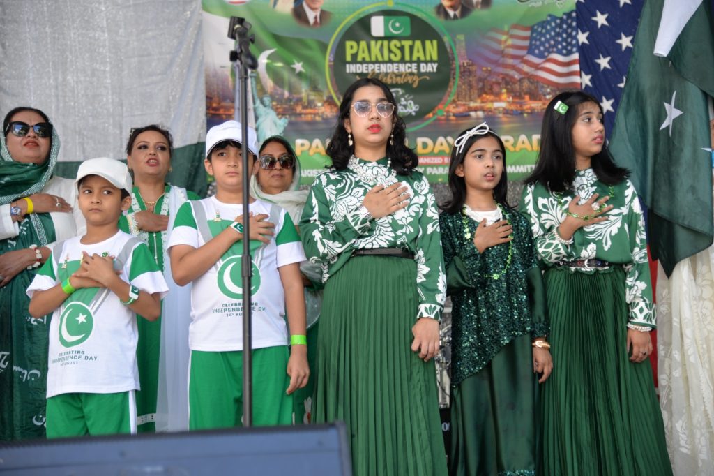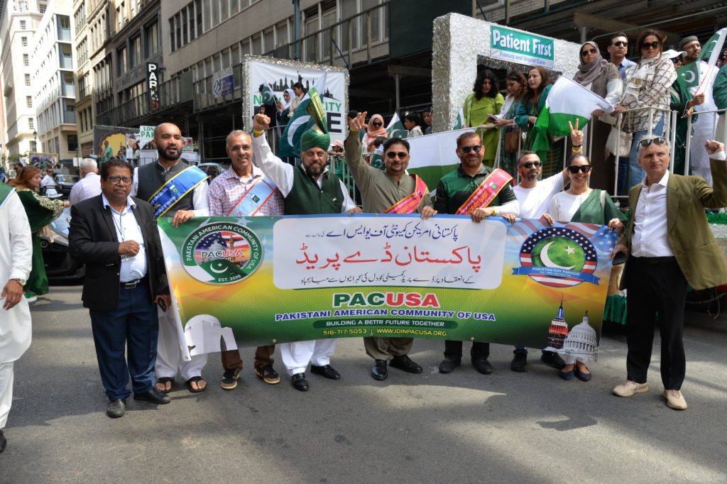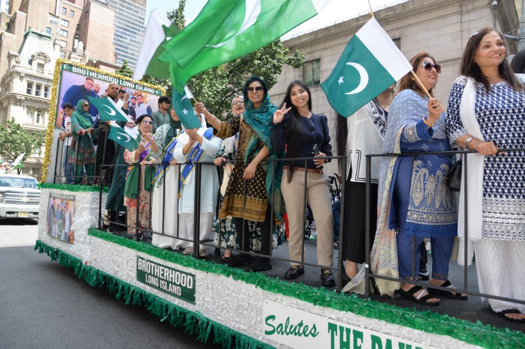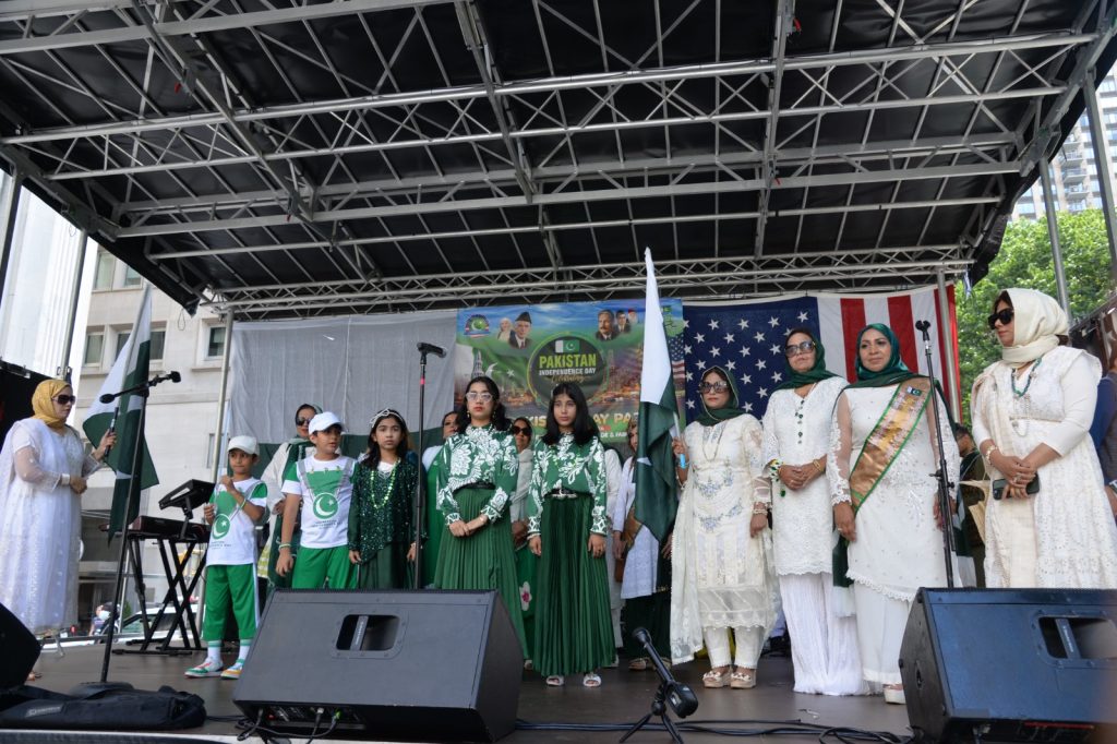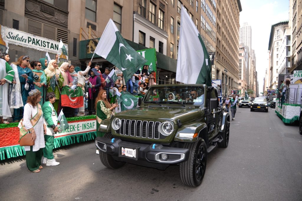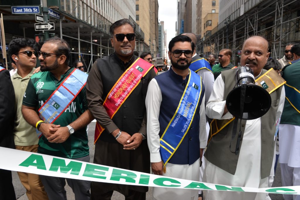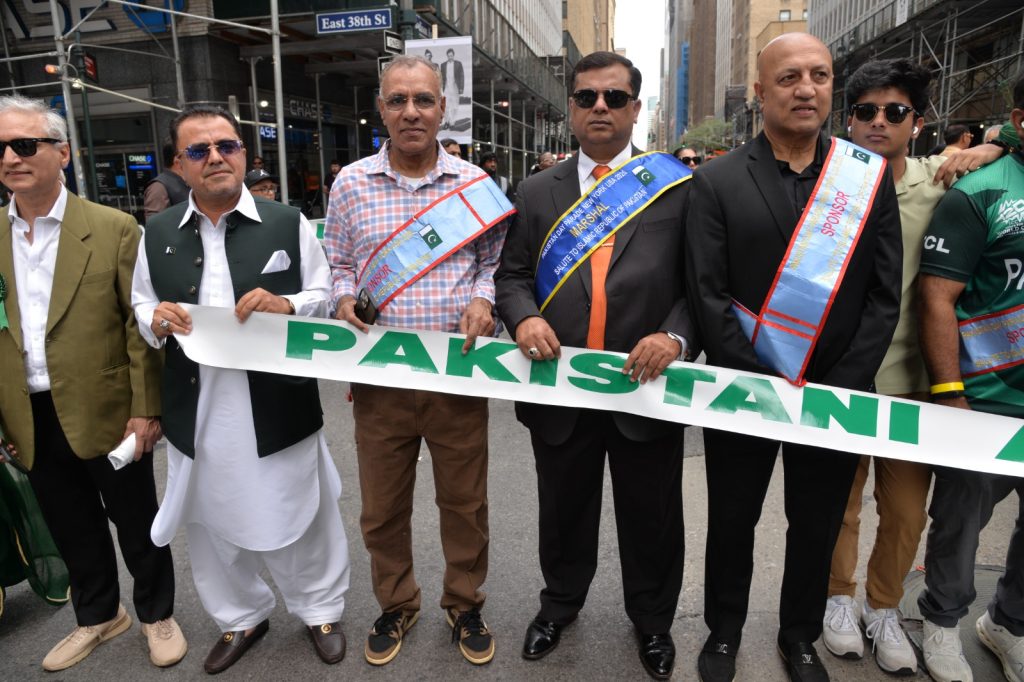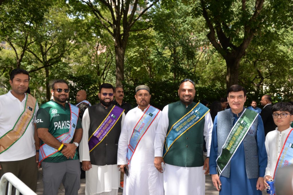 پاکستان کی آزادی کی 78 ویں سالگرہ کے موقع پر نیویارک کے کیپیٹل مین ہیٹن میں 41 ویں پاکستان ڈے پریڈ کمیٹی کے زیر انتظام منائے جانے والی جشن آزادی کی تقریب میں پاکستانی کمیونٹی سمیت سٹی اور سٹیٹ آفیشلز کی ایک بہت بڑی تعداد نے شرکت کی جہاں پر ہر طرف رنگا رنگ پاکستانی پرچم دکھائی دیے اور اس پریڈ کی سب سے بڑی خوبصورتی اس میں شامل مختلف کمپنیوں کے فلوٹس کی شمولیت تھی’ منیر لودھی کی سربراھی میں ہونے والی یہ خوبصورت پریڈ صبح 11 بجے سے شام چھ بجے تک نیویارک کے مڈ ٹاؤن مین ہیٹن کے 26 میں سٹریٹ سے لے کر 38 ویں سٹریٹ تک منعقد کی گئی جس میں پاکستانی ثقافت روایات اور یکجہتی کا مظاھرہ کیا گیا پاکستان انڈیپینڈنس ڈے پریڈ اینڈ فیئر کمیٹی کی جانب سے شرکا کے لئیے نہ صرف فری حلوہ پوری ناشتے کا اہتمام کیا گیا جبکہ کمیٹی انتظامیہ کی جانب سے خوش ذائقہ کھانوں اور دیسی بازار کے ثقافتی سٹالز روایتی کھانے اور قومی نغمے شامل تھے نیویارک کے کیپیٹل مین ہیٹن میں اتوار کے روز پاکستانی نژاد امریکیوں اور دیگر کمیونٹیز نے بھرپور جوش و جذبے کے ساتھ پاکستان کا 78واں یوم آزادی منایا پریڈ میں مرد خواتین اور بچے قومی لباس میں ملبوس پاکستان زندہ باد” اور “قائد اعظم زندہ باد” کے نعرے لگاتے رہے تقریب میں شامل کمیٹی انتظامیہ جن میں منیر لودھی’مرزا خاور بیگ’ جان احمد’ اسد چوہدری’ قاسم مجید’ مظفر بھٹہ اور کمیونٹی کے دیگر ممبران کا کہنا تھا کہ اج کا دن ہمارے لیے فخر کا دن ہے اور ہمیں چاہیے کہ امریکی معاشرے میں بھرپور شمولیت اور مثبت کردار ادا کریں تاکہ ہم پاکستان کا جھنڈا سر بلند کر سکیں