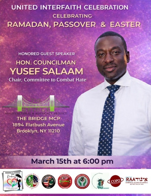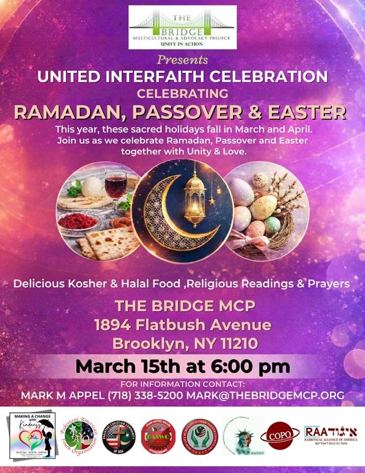 A unique interfaith gathering that brought together people of different religious traditions was held on March 15 at The Bridge Multicultural & Advocacy Project in Brooklyn. The event, titled United Interfaith Celebration, honored three major religious observances—Ramadan, Passover, and Easter—which fell during the same season this year.