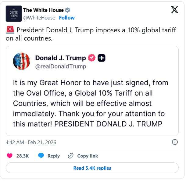 U.S. President Donald Trump moved swiftly on Friday, February 20, 2026, to replace tariffs struck down by the Supreme Court with a temporary 10% global import duty for 150 days while opening investigations under other laws that could allow him to re-impose the tariffs.